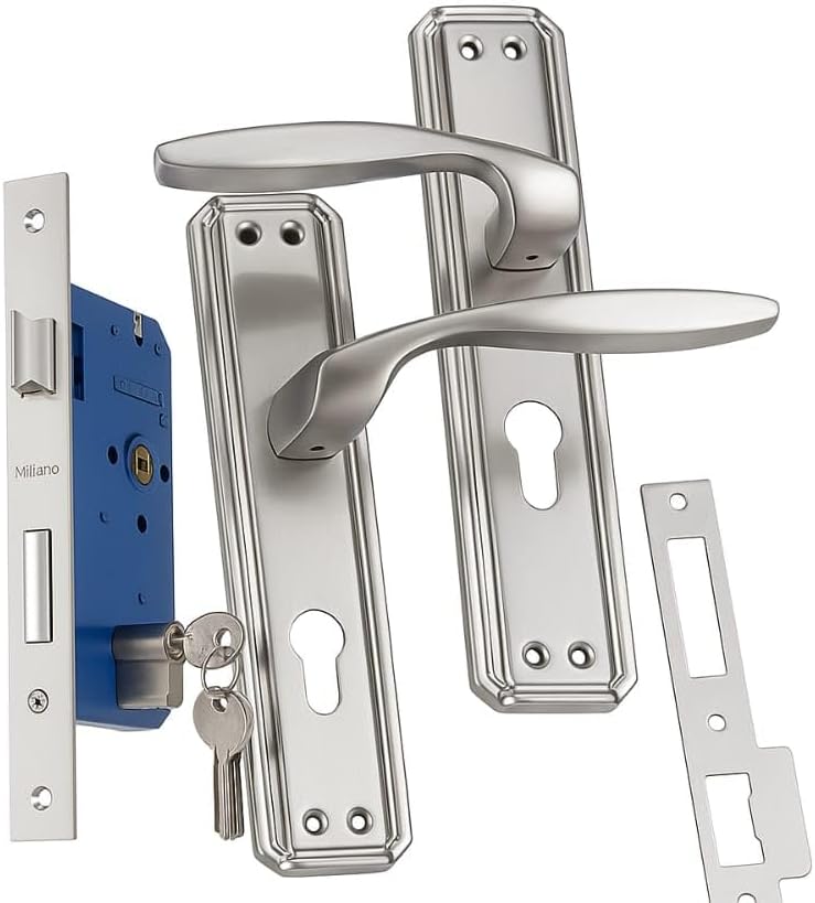 Complete Door Lock Set with Handle – Stainless Steel Mortise Lock with Euro Cylinder Keyhole & 3 Keys – Heavy Duty, Rust Resistant, Modern Brushed Finish for Interior & Exterior Doors
