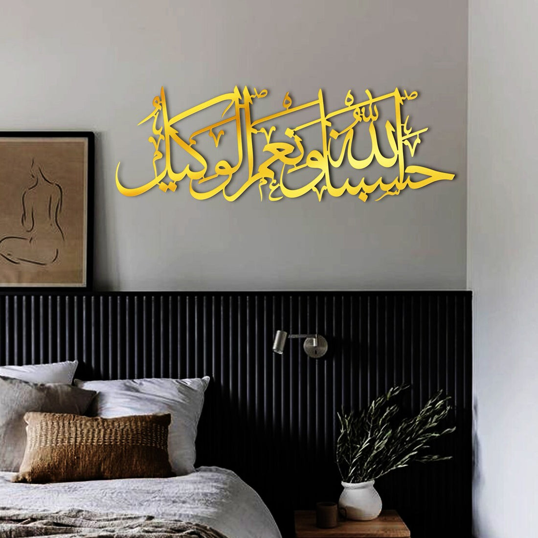 Stylish metal wall art featuring HasbunAllah Wa Ni’Mal Wakeel, symbolizing faith and trust in Allah while adding elegance to your home décor.