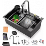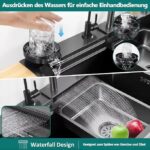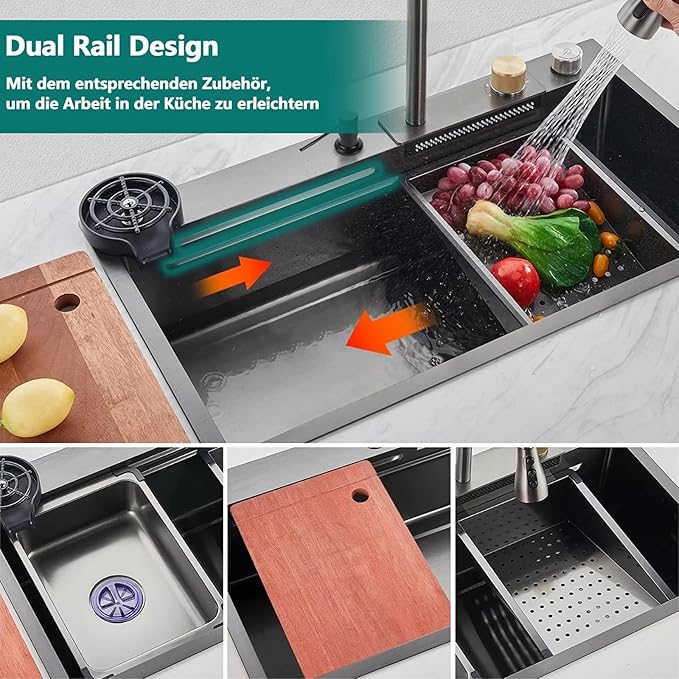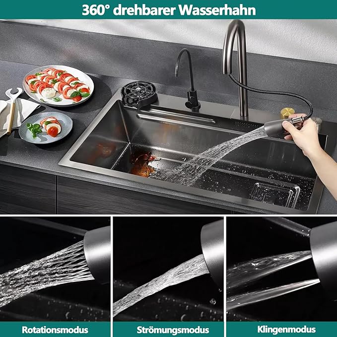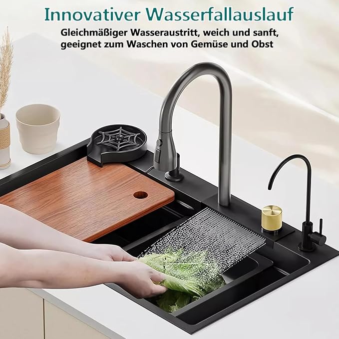 Multifunctional Waterfall Sink, Practical Sink, Built-in Sink with Fitting, Black Stainless Steel, Suitable for Bars, Balconies, Homes, Kitchens (Dark Gray, 85 x 45cm)